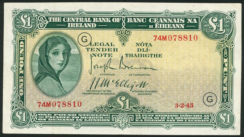 Central Bank of Ireland, £1, 3 February 1943, red prefix 74M, green and pale orange, Lady Lavery at left, Brennan/McElligott signatures, war time code letter G at right