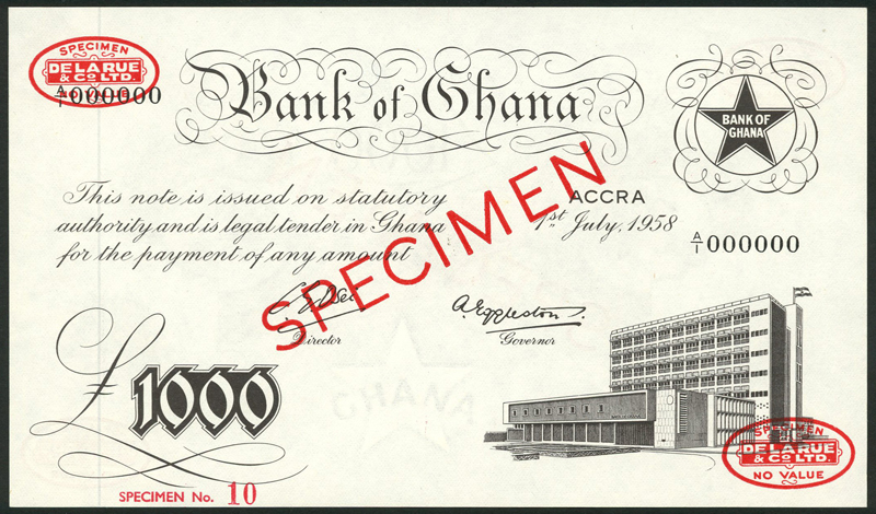 Bank of Ghana, specimen 10/-, 1958, £1,1958, £5, 1958, all with Bank of Ghana building in Accra at right centre, also specimen £1000, 1 July 1958, serial number A/1 000000, black and white, Bank of Ghana building low right