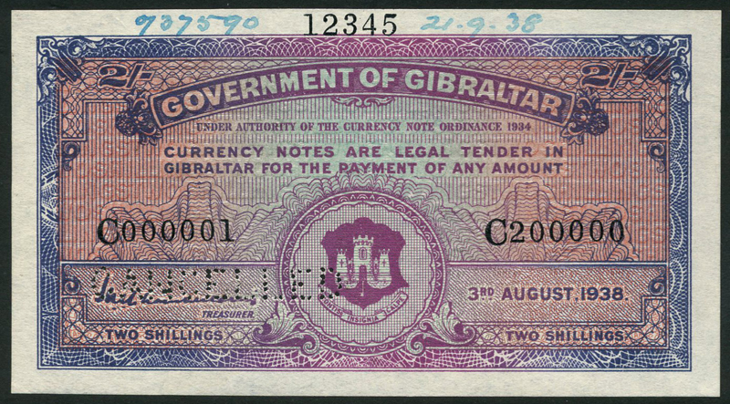 Government of Gibraltar, uniface specimen 2 shillings, 3 August 1938, serial number C 000001-C 200000, blue and purple, arms low centre, value at each corner