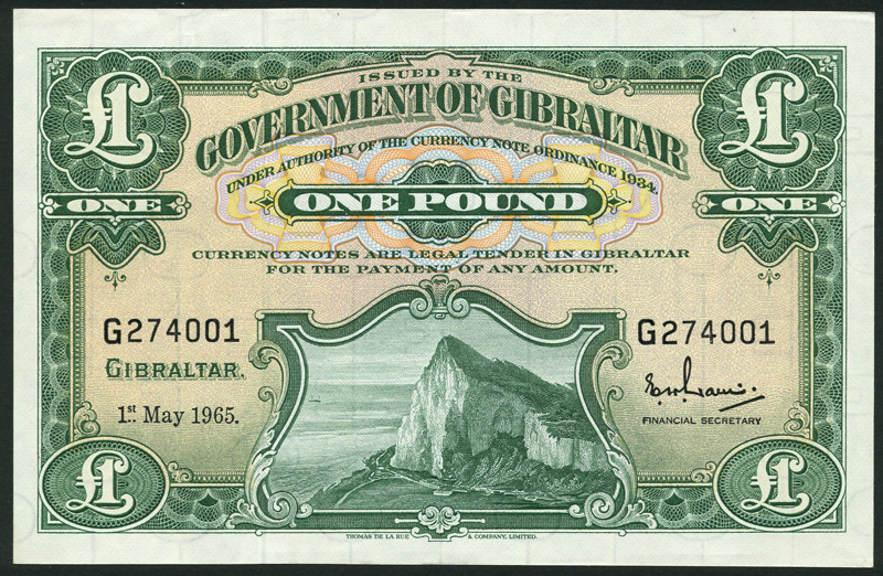 Government of Gibraltar, £1, 1 May 1965, serial number G274001, green on multicolour underprint, Rock of Gibraltar at low centre, value at top centre and each corner, reverse green arms and values