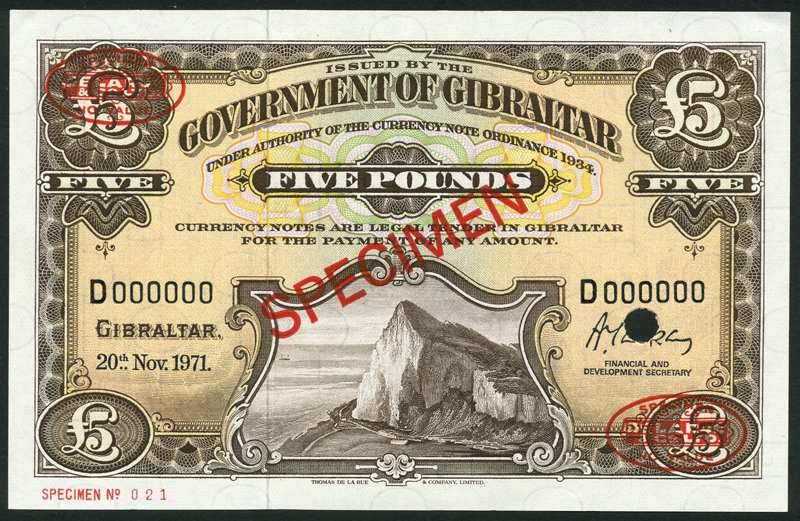 Government of Gibraltar, specimen £1, green, £5, brown, 20 November 1971 and a specimen £1 and £5 of 20 November 1975, prefix H on £1 and D on £5, the Rock at centre