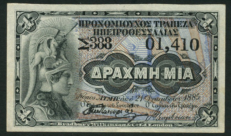 Ipirothessalia Bank (Privileged Bank of Epirus and Thessaly), 1 drachma, 21 December 1885, serial number 388 01410, black on multicolour underprint, head of Athena at left, value at each corner