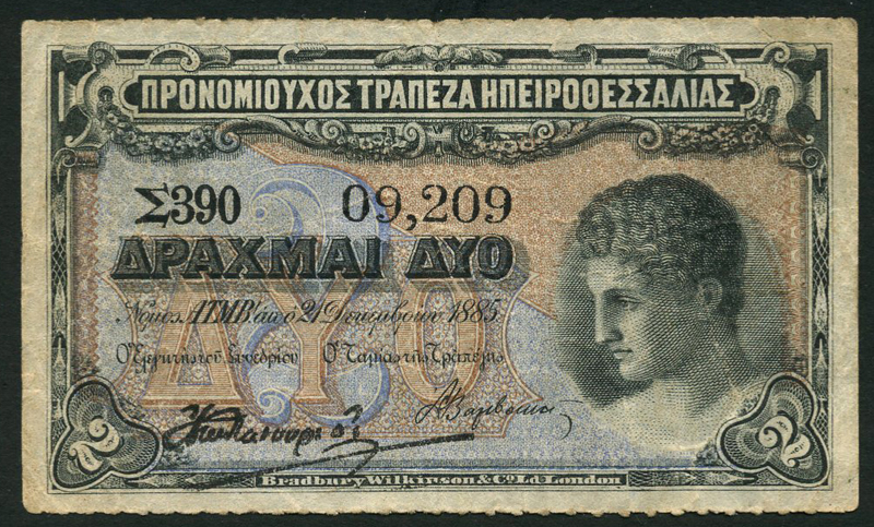 Ipirothessalia Bank (Privileged Bank of Epirus and Thessaly), 2 drachma, 21 December 1885, serial number 390 03209, black on multicolour underprint, head of Hermes at right, value at low left and right