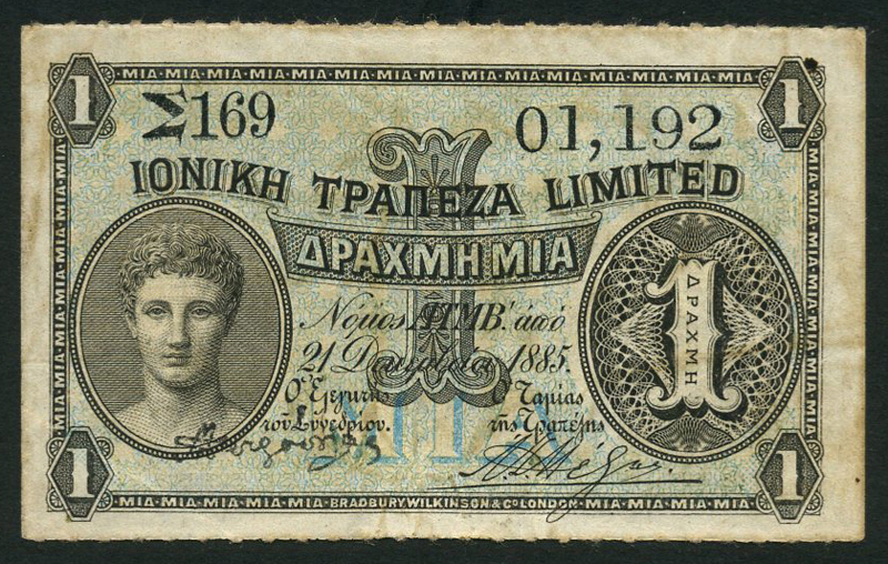 Ionian Bank, 1 drachma, 21 December 1885, serial number 169 01192, black on green and blue underprint, Alexander of Macedon at left