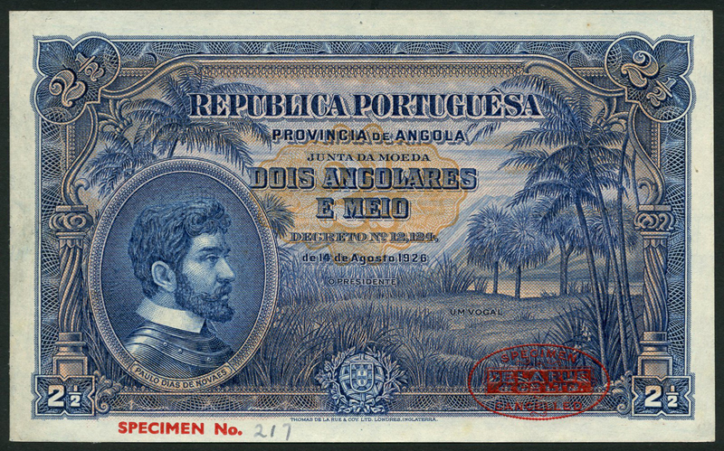 Republica Portuguesa, Angola, colour trial 2 1/2 angolares, 1926, blue and orange, De Novaes at left, arms low centre, also specimen 2 1/2 angolares, purple and green, De Novaes at left, specimen 2 1/2 angolares, purple and pale green, 1948, siege scene