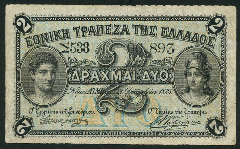 National Bank of Greece, 2 drachma, 21 December 1885, serial number 538 06893, black on multicolour underprint, Hermes at left, Athena at right, value at centre and each corner