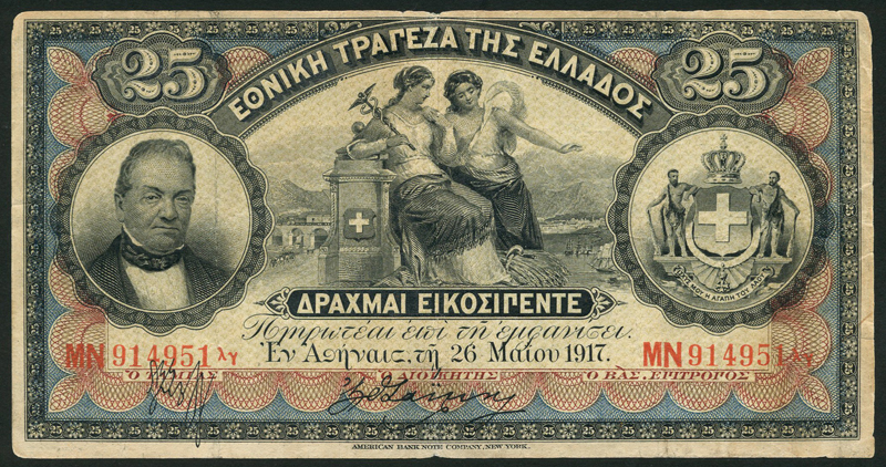 National Bank of Greece, 25 drachmai, 26 May 1917, serial number MN914951, black, red and blue, G. Stavros at left, arms at right