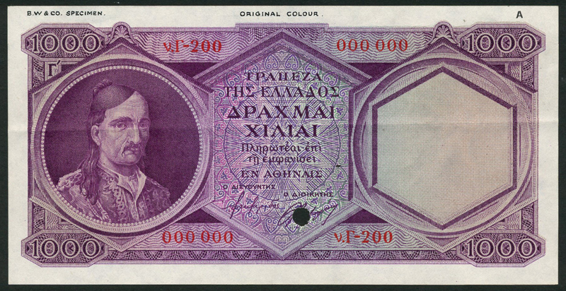 Bank of Greece, colour trial 1000 drachmai, ND (type of 1944), red serial numbers, purple and multicoloured, Kolokotronis at left, reverse purple, soldier at centre
