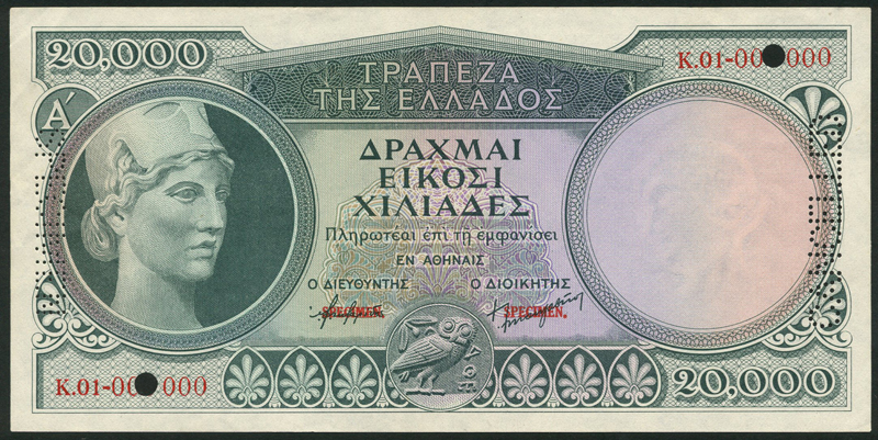 Bank of Greece, specimen 20000 drachmai (2), ND (1946, 1947), green and lilac, Athena at left, coin low centre, the first note larger format than the second note, also a specimen 10000 drachmai, ND (1945), serial number A01-000001-A04 700000, orange, Hesiod at left