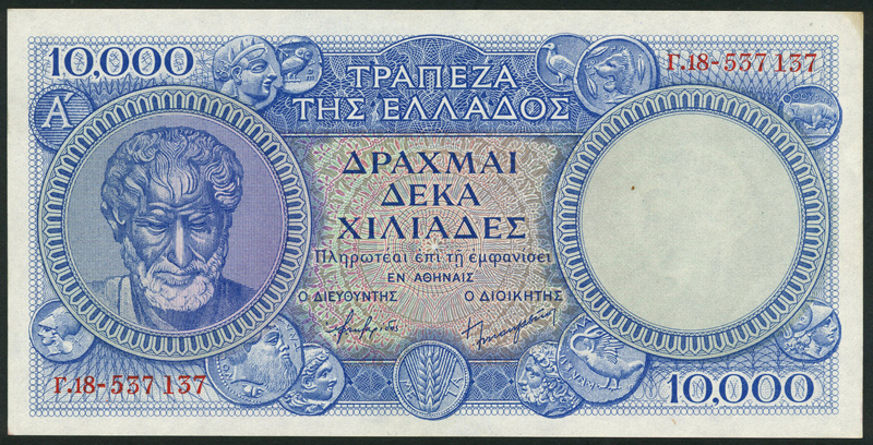 Bank of Greece, 10000 drachmai, ND (1946), serial number 18-537137, blue, Aristotle at left, ancient coins in border