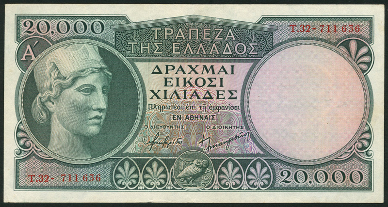 Bank of Greece, 20000 drachmai, ND (1947), serial number T.32-711 636, blue on multicolour underprint, head of Athena at left, coin with owl at low centre