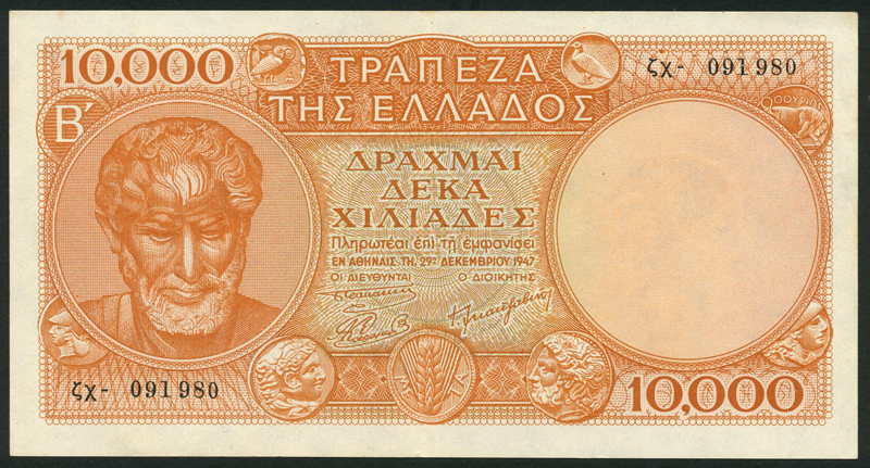 Bank of Greece, 10000 drachmai, 29 December 1947, serial number 091980, orange-brown, Aristotle at left, ancient coins in border