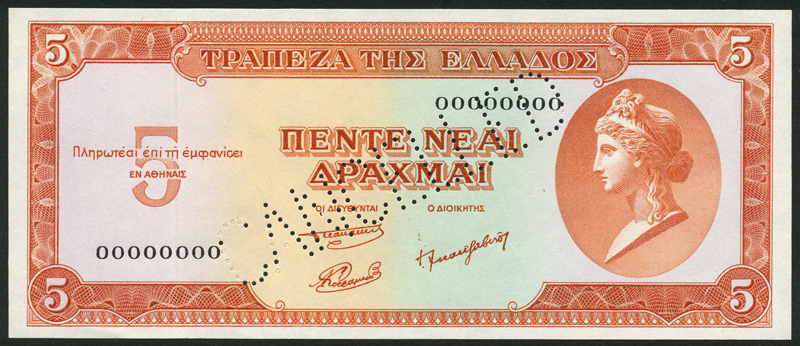 Bank of Greece, a specimen 5 drachmai, ND (c 1954), black zero serial numbers, orange and pale green, maiden at right, reverse green, lilac and pale orange, value at centre and at left and right