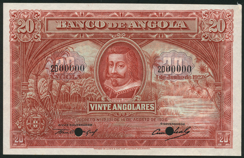 Republica Portuguesa, Angola, colour trial 20 angolares, 1 June 1927, black serial number 2D 00000, red and lilac, Salvador Correia at centre, jungle river in field, value top left and right, arms low left, reverse red, hippopotamus at centre