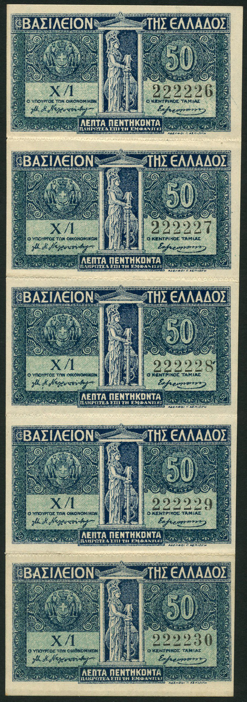Kingdom of Greece, uncut sheet of five 50 lepta, ND (1920), serial numbers X/1 222226-30, blue on green underprint, Athena at centre, arms at top left, value at top right, reverse blue, three coins at centre, left and right, zig-zag perforations