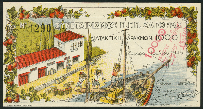 Greece, Co-operative credit notes of Zagora, 100, 500,1000 and 10000 drachmai, 1 July 1945, green, red and white, boat loading at quayside, the 10000 with red handstamp top right