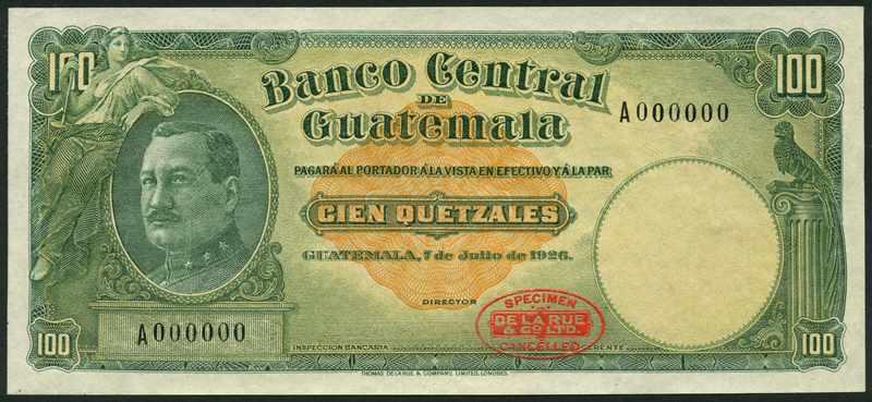 Banco de Guatemala, colour trial 100 quetzales, law of 1926, black serial number A 000000, green , pale yellow with a pale brown central guilloche, General J. Maria Orellana at left, reverse green, monument at centre