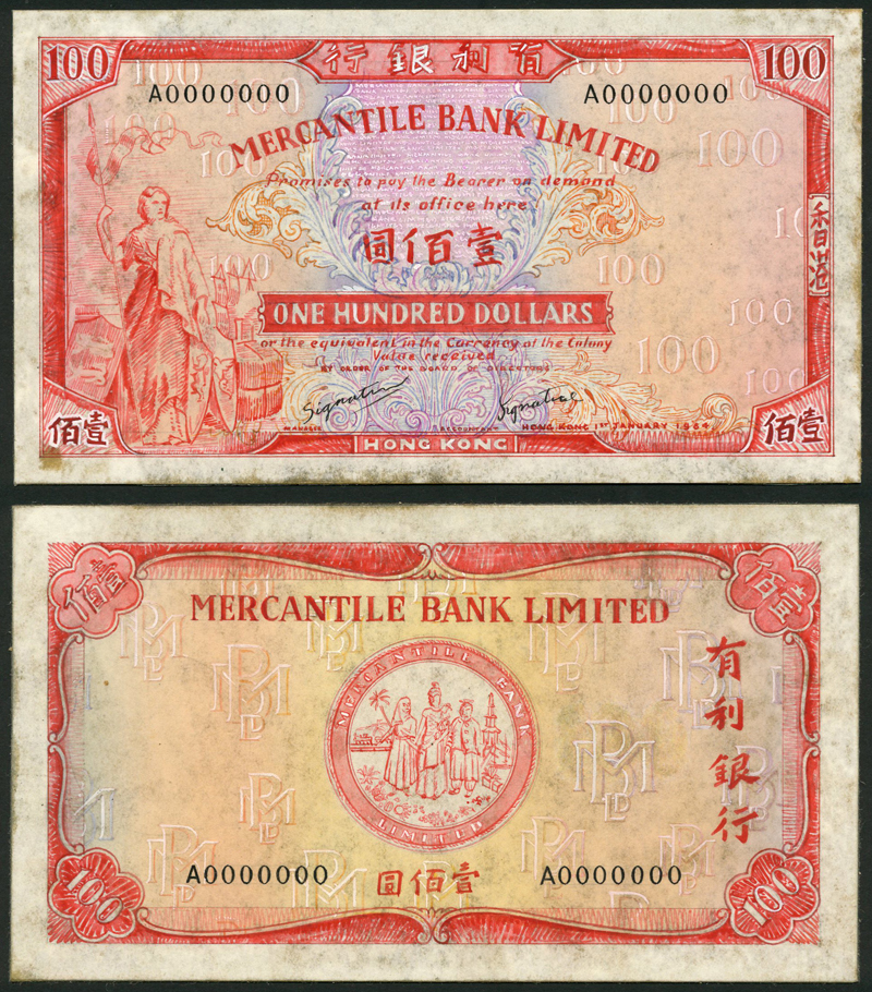 Mercantile Bank of India Limited, an obverse and reverse composite essay for a $100, 1 January 1964, serial number A 0000000, red and pale blue and lilac, maiden at left with allegorical symbols of trade, reverse red and pale orange, seal at centre, value at each corner