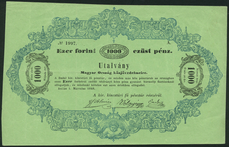 Utalvany (under Austrian Administration), 1000 fiorint, 1849, serial number 1997, black text on green paper, ornate border of cherubs, value at left and right and top centre, three printed signatures below,