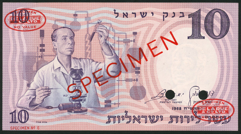 Bank of Israel, specimen 5 lirot, 1958, brown, worker with hammer at left, specimen 10 lirot, 1958, purple, scientist at left