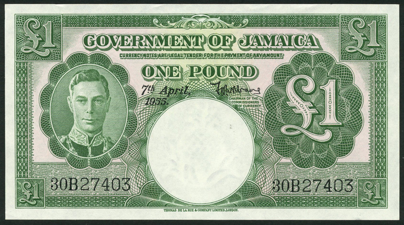 Government of Jamaica, £1, 7 April 1955, serial number 30B 27403, green and pink, George VI at left, value at right , reverse green and pink, value