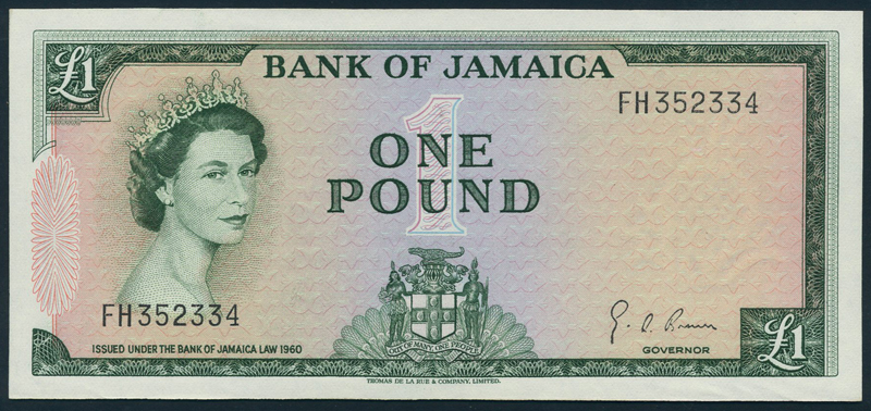Bank of Jamaica, £1, Law of 1960 (1964), prefix FH, green and pale orange, Elizabeth II at left, arms low centre, value at centre, top left and low right, Brown signature, Gothic serial number variety, reverse blue