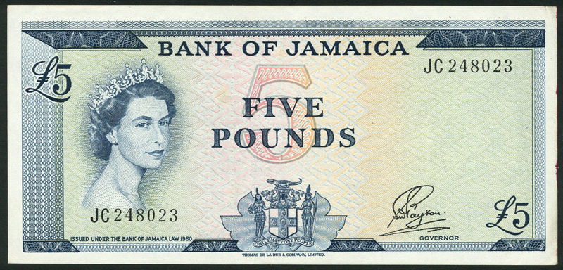 Bank of Jamaica, £5, Law of 1960 (1964), serial number JC 248023, blue, pale orange and green, Elizabeth II at left, arms low centre, value at centre, top left and low right, Payton signature, Gothic serial number variety, reverse blue and white, industrial plant at centre