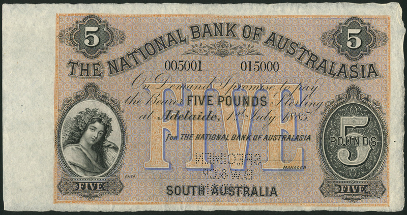 National Bank of Australasia, specimen £5, Adelaide, 1 July 1885, serial number 005001-015000, black, blue and orange, Ceres low left in circular frame, value low right, value in orange and blue low centre, reverse blue and orange, value at centre, medallic female head at left and right