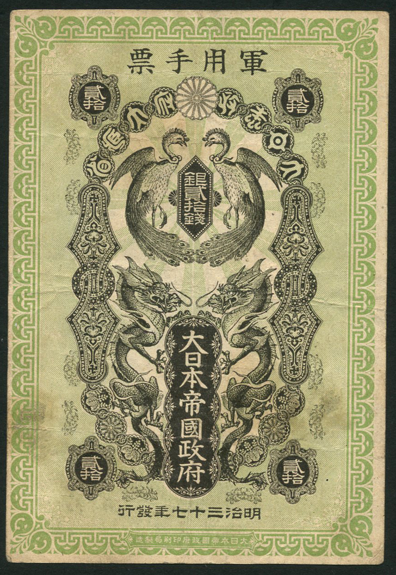 Russo-Japanese War issue, 10 sen (2), ND (1904), black, pink and white, two onagadori cockerels at top, two dragons below, one variety with serial numbers on reverse, one variety without, also 20 sen in green and white