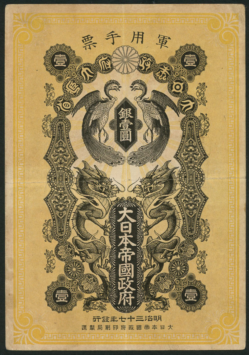 Japanese Military Currency, 1904 Russo-Japanese War issue, 1 yen, 1904, black on ochre underprint, Onagadori Cockerels at top centre, dragons at low centre, reverse ochre