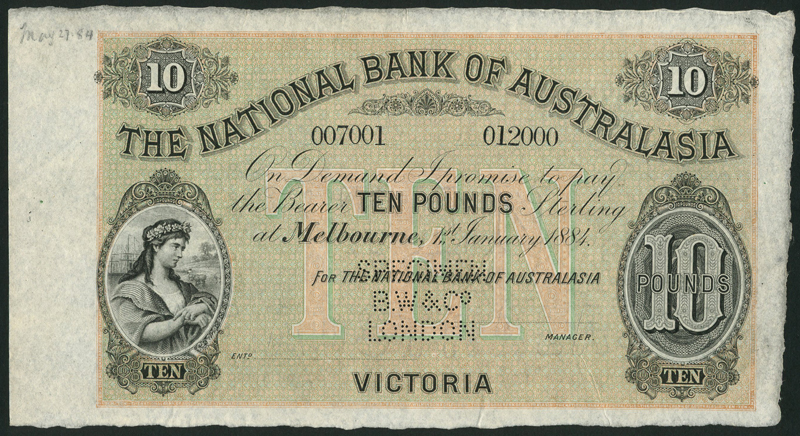 National Bank of Australasia, specimen £10, Melbourne, 1 January 1884, serial number 007001-012000, green and pale salmon, maiden at left, value at right, reverse green and pale orange, medallic female head at left and right, value at centre