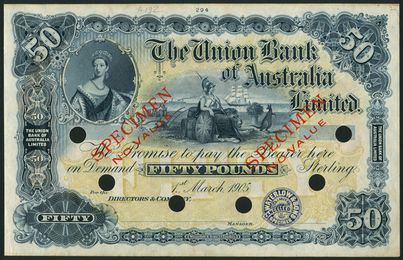 The Union Bank of Australia Limited, specimen £50, 1 March 1905, no serial numbers, black on yellow underprint, Victoria at top left, Britannia with lion, wallaby and ships at centre, value in tablet at centre and at each corner, reverse brown, ornate design with Australian arms and values