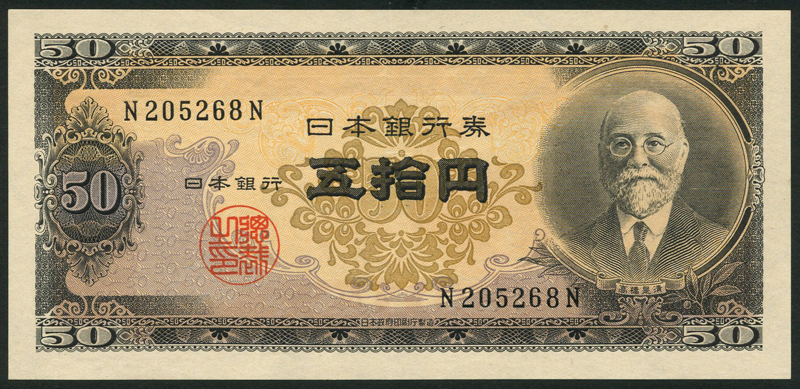 Bank of Japan, 5 sen (7), 10 sen (2), 1 yen (6), 5 yen (3), brown and green,10 yen (2), black and pale blue, 50 yen, Korekiyo at right, 100 yen (3), Shotoku-taishi at right, 100 yen (6), Taisuke at right, 500 yen (4), Tomomi at right