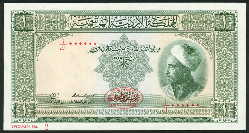 Hashemite Kingdom of Jordan, specimen 1 dinar, law of 1949, red zero serial numbers, green and pale orange and white, King Abdullah at right, signature 2, reverse green and white, ruins at centre, column at left and right
