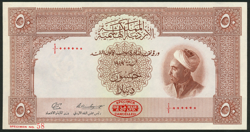 Hashemite Kingdom of Jordan, specimen 50 dinars, law of 1949, red serial number A/A 000000, brown and pale green, King Abdullah at right, signature 2, reverse brown and white, Aqaba beach