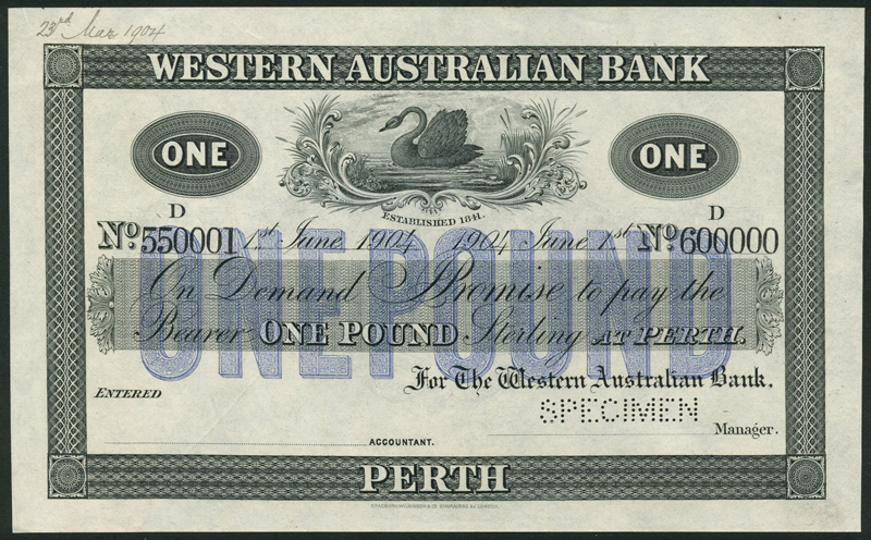 Western Australian Bank, specimen £1, Perth, 1 June 1904, serial number 550001-600000, black and white, value in blue underprint at centre, black swan top centre, reverse blue and white, value at centre