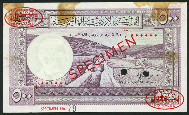 Hashemite Kingdom of Jordan, specimen 500 fils, law of 1949, red zero serial numbers, lilac and white, irrigation ditch, signature 3, reverse lilac and white, cattle at centre
