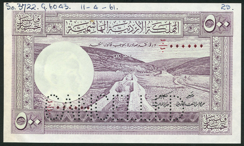 Hashemite Kingdom of Jordan, specimen 500 fils, law of 1949 (1961), maroon zero serial numbers, lilac, irrigation ditch at centre, signature 4, reverse lilac, cattle at centre