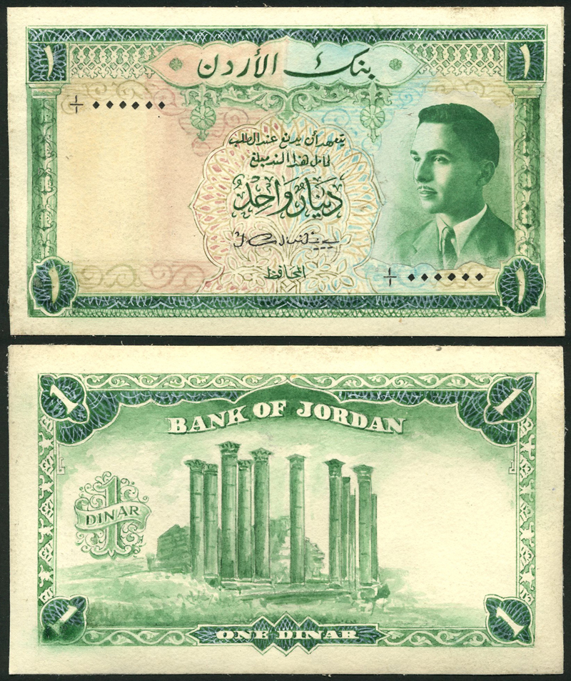 Bank of Jordan, an obverse and reverse composite essay for a 1 dinar, ND (ca 1952), serial number 1/1 000000, green, pale pink and blue, King Hussein at right, value at each corner, reverse green, ancient columns, value at left
