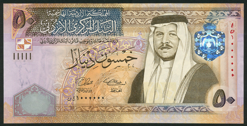 Central Bank of Jordan, specimen set of the 6th issue, comprising 1 dinar, 2009, green, 5 dinars, 2008, orange, 10 dinars, 2007, blue, 20 dinars, 2009, green, and 50 dinars, 2008, orange and purple