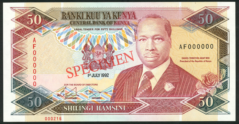 Central Bank of Kenya, specimen 20 shillings (2), 1990 and 1992, and specimen 50 shillings, 1992, zero serial numbers, blue and red respectively on multicolour underprint, both with President Daniel Arap Moi at right, arms at centre left, value at each corner