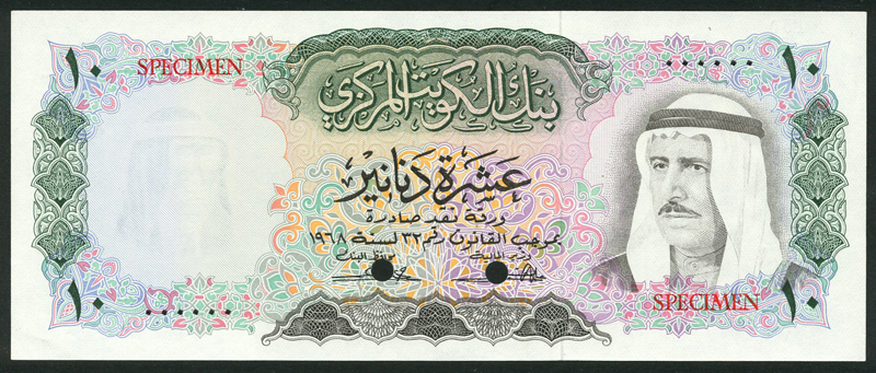 Central Bank of Kuwait, specimen 10 dinars, L.1968, zero serial numbers, green and brown on multicolour underprint, Amir Shaikh Abdullah at right, value at each corner, reverse green, dhow at centre