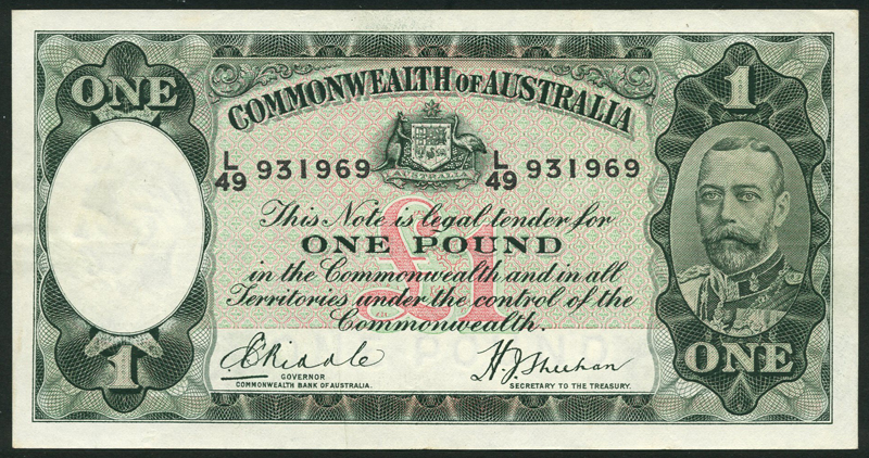 Commonwealth of Australia, £1, ND (1933-38), serial number L/49 931969, dark green on red underprint, George V at right, arms at top centre, value at each corner, reverse green, frieze showing sheep shearing