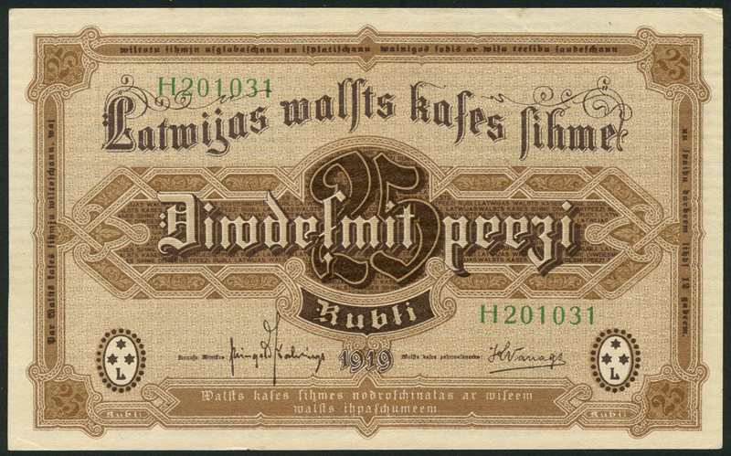 Latvia Republican Government, 25 rubli (2), 1919, serial numbers 419745G and H201031, brown on light brown and tan underprint, value at centre and top left and right