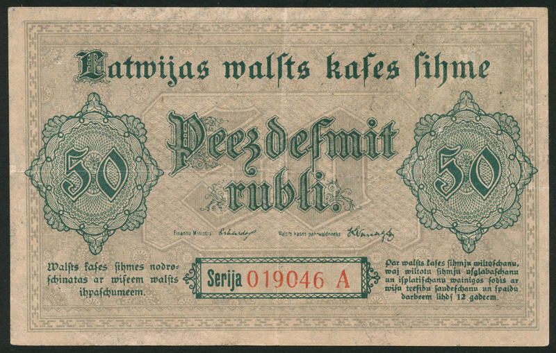 Latvia Republican Government, 50 rubli, 1919, serial number 019046A, dark green on grey, 100 rubli, 1919, serial number 352029, dark brown and light brown, and 1 rubli (2), 1919, green