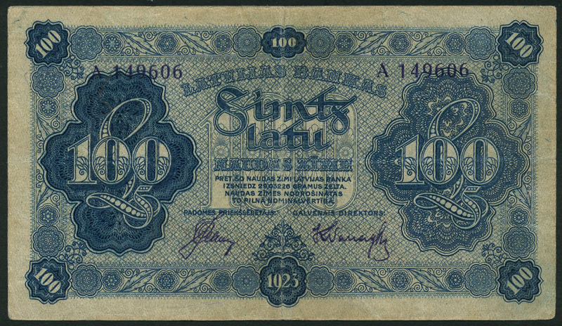 Bank of Latvia, 100 latu (2), 1923, serial numbers A149606 and A156855, dark blue on blue and green underprint, value at left and right and in border, reverse allegories of trade and farming