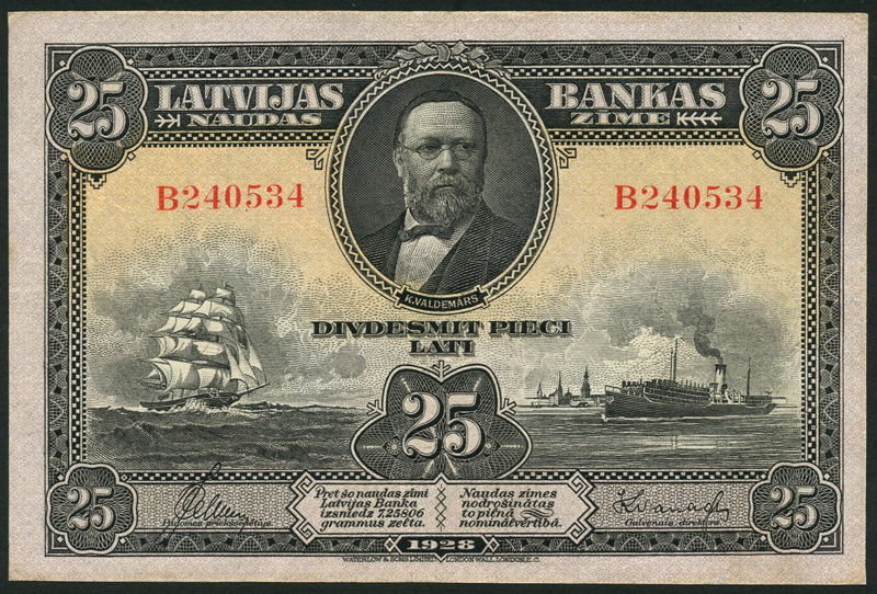Bank of Latvia, 25 latu, 1928, serial number B240534, black on pale green and yellow, K. Valdemars at top centre, ships at low left and right, value at low centre and each corner, reverse green, arms and values