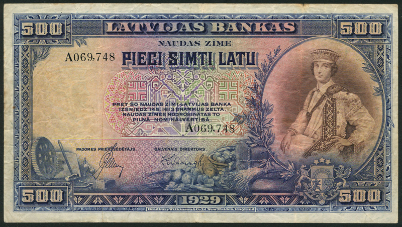 Bank of Latvia, 500 latu, 1929, serial number A069748, dark blue on multicolour underprint, girl in national costume at right, arms at low right, value at each corner, reverse green, cows and wheat sheafs at centre, value at left