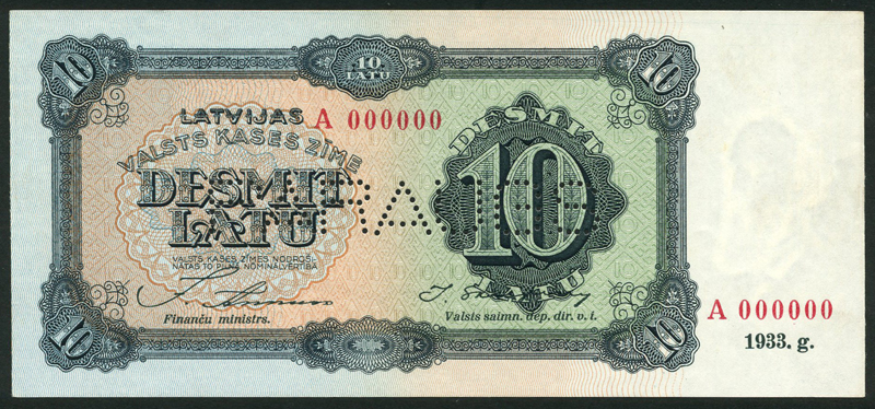 Latvian State Treasury, specimen 10 latu, 1933, zero serial numbers, also an issued note of the same type, 1934, serial number AH071705, dark green on multicolour underprint, value at right centre and in borders, reverse arms at right, woman in national dress with corn sheaf at centre, also 25 latu, 1938, serial number B779596, green