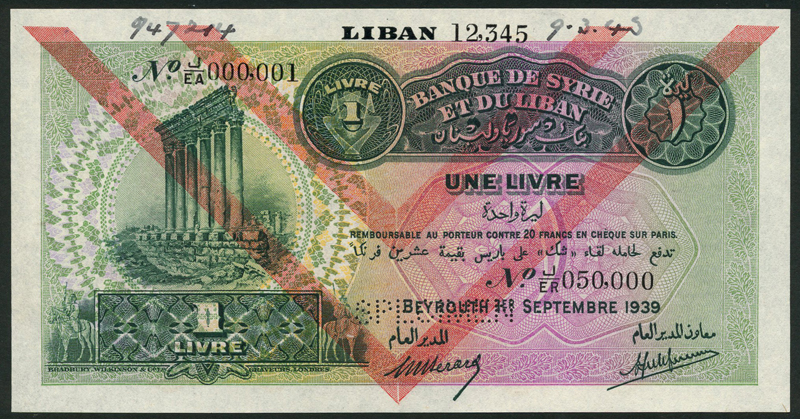 Banque de Syrie et du Liban, specimen 1 livre, 1 September 1939, serial number J/EA 000001-J/ER 050000, green and multicoloured, the pillars at Baalbek at left, black LIBAN top centre, reverse red and green, red chevron on obverse and reverse